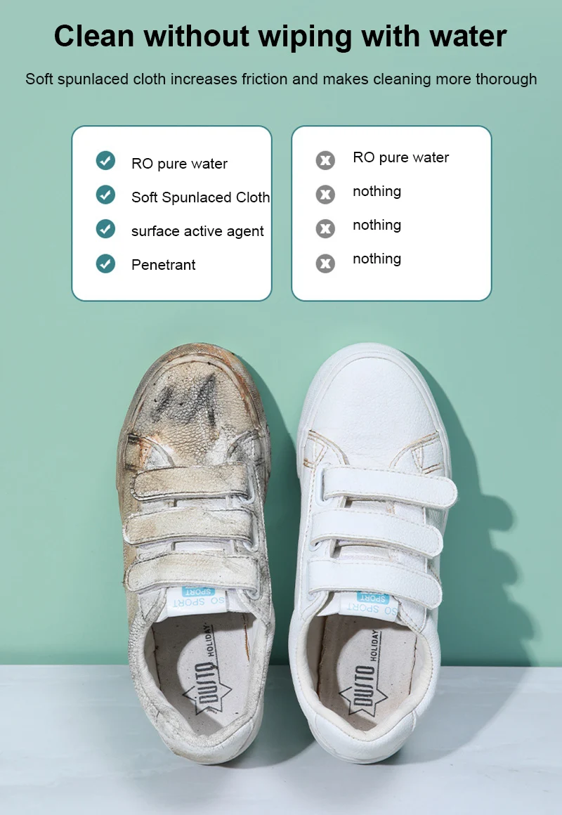 - No Water Needed: Our excellent shoe cleaning wipes are easy to clean using soft, high-strength, spunbonded fabric with increased friction, ensuring a thorough clean without water.